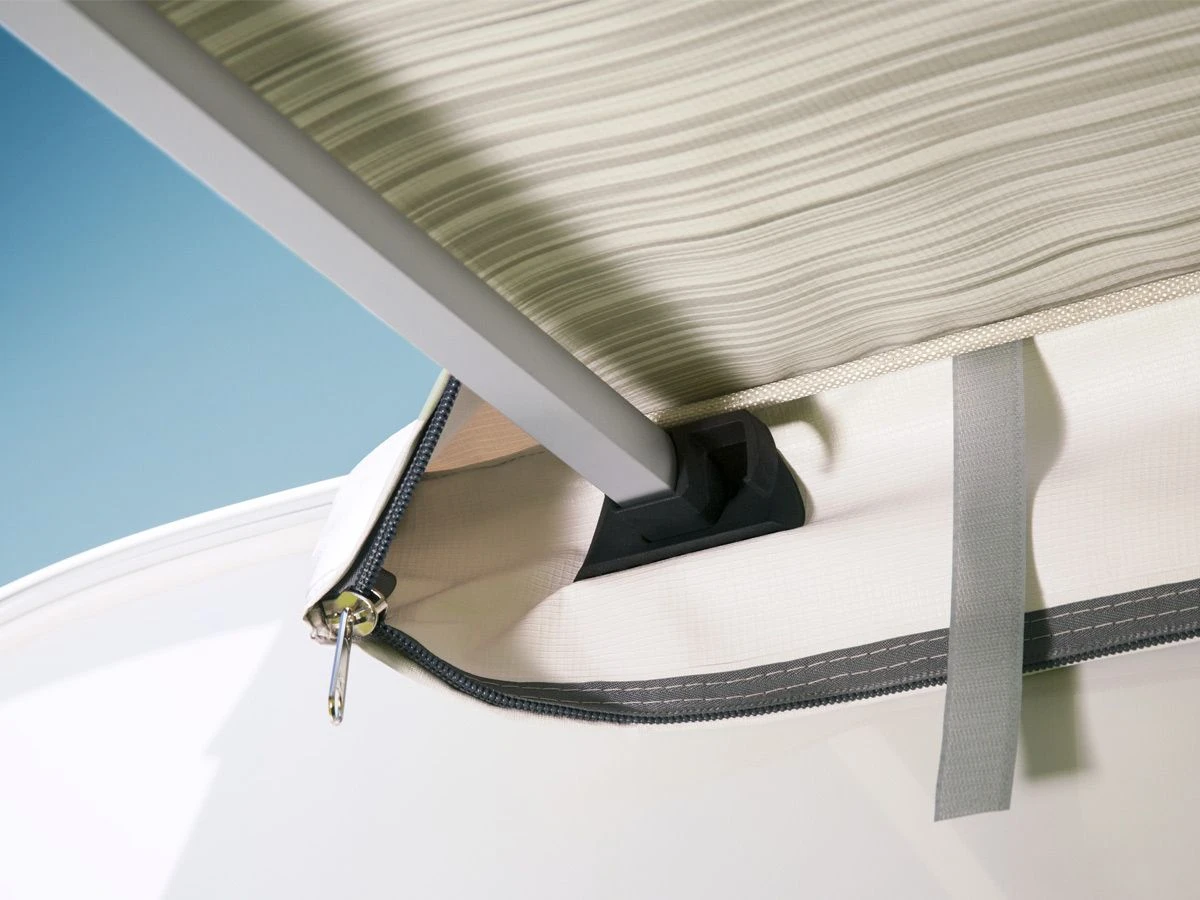 De Thule Omnistor 1200 past alleen in het rechte gedeelte van je caravanrail. Meet daarom altijd van tevoren na hoe lang dit stuk rail precies is. Heb je bijvoorbeeld een rechte caravanrail van 410 cm, dan past de Omnistor 1200 met een lengte van 400 cm perfect.