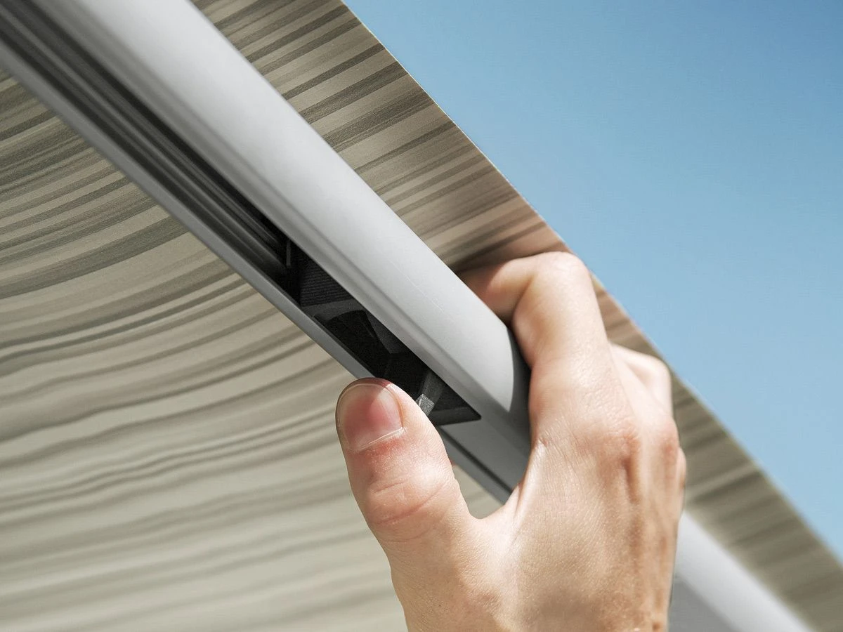 Het doek van de Thule Omnistor 1200 is gemaakt van extra stevig PVC en staat mooi strak dankzij het gepatenteerde doekspansysteem. Hiermee kan je de liggers van de luifel altijd op de juiste spanning brengen, en heb je nooit last van een klapperend doek.